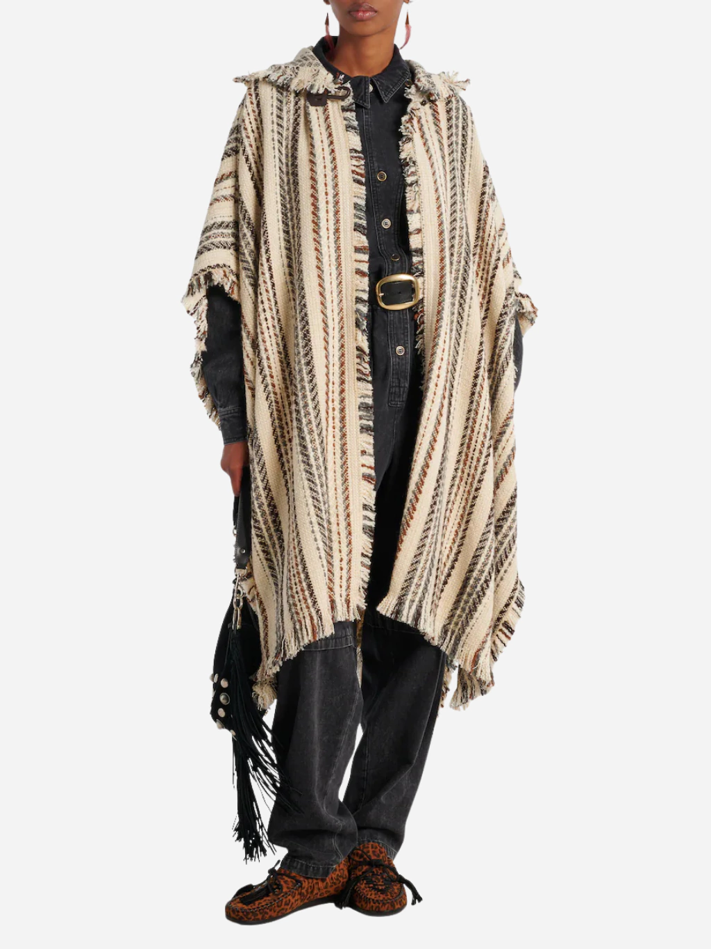 Con la desenfada elegancia parisina que caracteriza a Isabel Marant, la capa Iseline se transforma en la pieza clave para vestir con soltura y sofisticación. Su corte envolvente de silueta oversize permite superponerla con facilidad, mientras que las delicadas rayas, el cuello tipo capucha y el cierre de botones revelan una atención al detalle sin esfuerzo. Confeccionada en una mezcla textil refinada (aproximadamente 39 % algodón, 36 % acrílico y 22 % lana), aporta ligereza, calidez y caída natural. Los bordes con flecos añaden un toque artesanal que remite al savoir-faire de la maison. Una capa atemporal que redefine el outerwear francés con actitud relajada y presencia impecable.